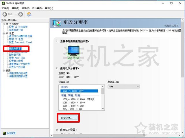 1、这里我们以NVIDIA显卡(N卡)为例,鼠标右键桌面空白处选择“NVIDIA控制面板”,在NVIDIA控制面板界面中,我们点击“更改分辨率”,在右侧窗口中点击“自定义”按钮,如下图所示。