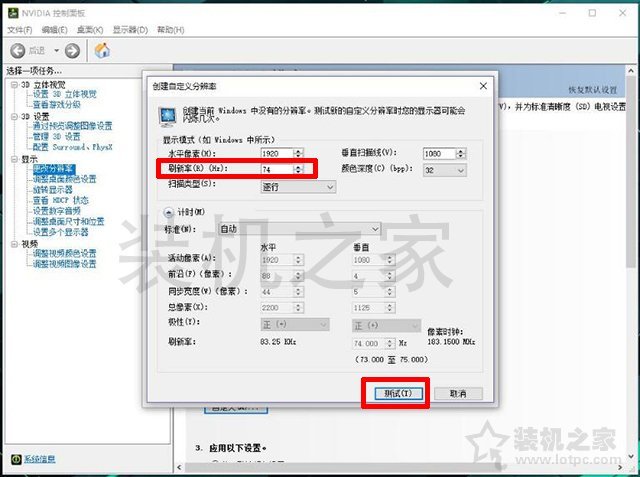 3、找到刷新率,输入刷新率,建议设置从70Hz起,以5hz为单位向上调,不建议一下就调整为144Hz,几率很小,需要一步一步微调,直到找到合适的帧率。比如我们调到75Hz出现了黑屏或者花屏的情况下,说明并不合适,我们需要往下调整,如果我们调整到74Hz,一切正常,那么最佳无疑是74Hz,这就意味着我们显示器屏幕刷新率最高可超频至74Hz。