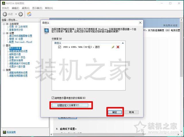 2、我们点击“创建自定义分辨率”按钮,并点击“确定”按钮,如下图所示。