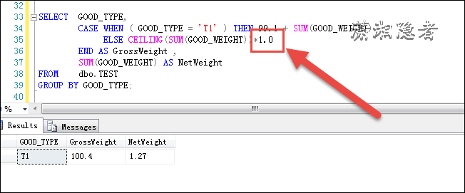 如上所示,为什么99.1 + SUM(GOOD_WEIGHT)变成100了呢? 原始SQL非常复杂,我们分析、排除掉各个因素后,始终不得要领,各种折腾中发现,如果这样转换一下(请见下面截图),居然就OK了,后面分析了一下,应该是CASE WHEN里面的不同数据类型导致隐式转换,说实话之前还真没有留意CASE WHEN中存在数据类型的隐性转换,但是为什么就一定从NUMERIC转换为INT了呢? 而不是INT隐性转换为NUMERIC呢, 说实话没有看到相关文档的官方,如果按照官方文档: