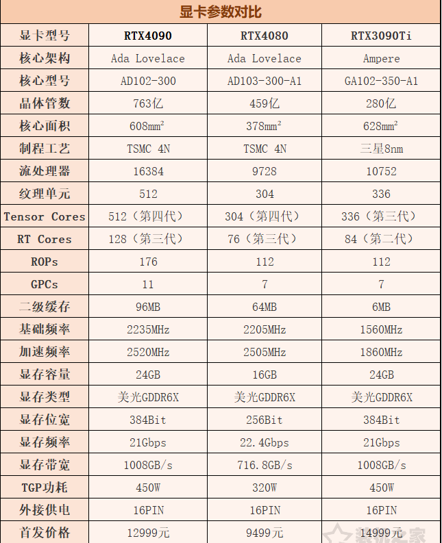 RTX4090和RTX4080、RTX3090Ti参数对比