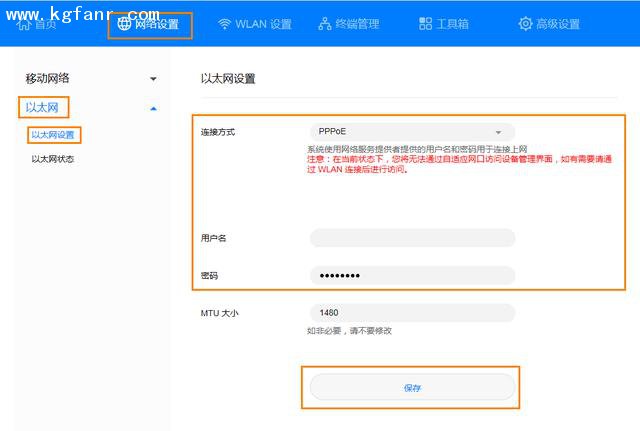 3、选择“网络设置 > 以太网 > 以太网设置”。在连接方式下拉框中,选择“PPPoE”(此处以PPPoE连接方式为例说明。具体如何选择网络连接方式,请参照下表进行判断),填写宽带服务商提供给您的上网帐号和密码,点击保存。
