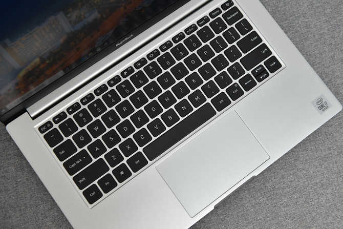 由于边框缩减,机身尺寸变小,整个笔记本的C面可利用的空间也有一定的缩减。所以这款RedmiBook 14 Ⅱ的键盘和触控板在位置上更加的紧凑,触控板由于体积没有改变,所以使用起来稍有些靠近下边缘。RedmiBook 14 Ⅱ也没有配置指纹识别,不过关于解锁和安全性方面RedmiBook 14 Ⅱ有更好的解决方案,通过感应钥匙功能就可以通过小米穿戴设备直接解锁。