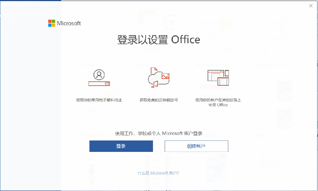 2. 打开应用后,会弹出“登录以设置Office”界面,如果您有微软帐户,点击“登录”;如果没有微软帐户,点击“创建帐户”并按照提示注册一个。