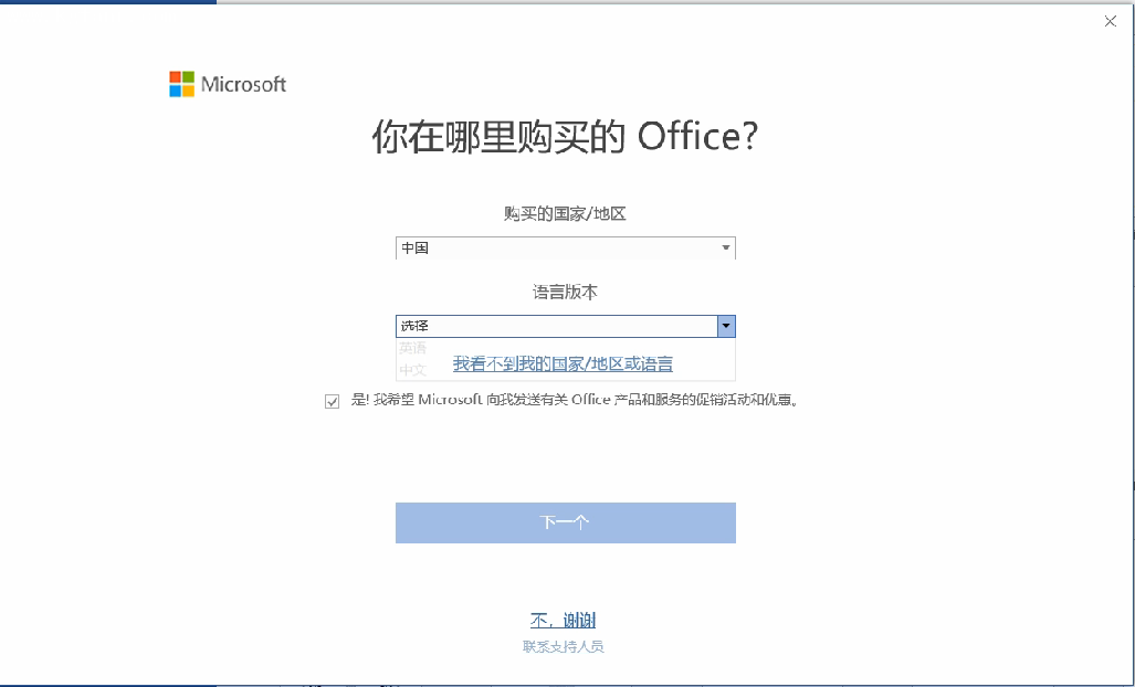 4. 根据提示设置地区和语言版本,选择“中国”和“中文”,点击“下一个”。