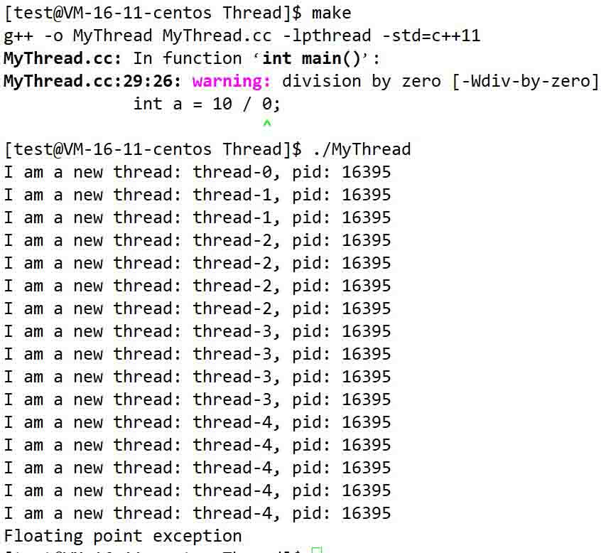 从中看出的一个问题是,当出现除0错误的时候,所有的线程都被终止了,这是因为所有的线程都共享信号的处理方式,所以当有一个线程收到信号后,其实所有的线程也就都被终止了