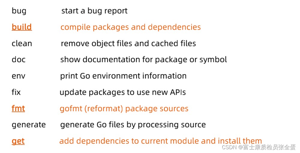 build:从源代码构建成可执行文件get:下载一个包install:go install从github上面下载某一个包并且安装到本地,相当于是编译安装,所以很多时候开发一个go语言项目,上传到GitHub上面,你希望别人可以使用你的项目,如果go get会将源代码下载下来,如果是go install那么会将源代码下载下来,编译完成直接安装,接下来就可以直接使用。