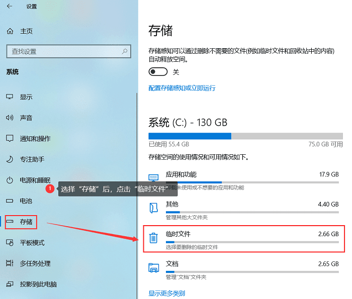 3. 可以使用Windows自带的存储感知功能清理,进入开始菜单设置——存储——打开“【配置存储感知或立即运行】”,便可以清理这些文件了。