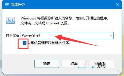 3. 接着勾选“以系统管理权限创建此任务”,输入“powershell”,回车打开。