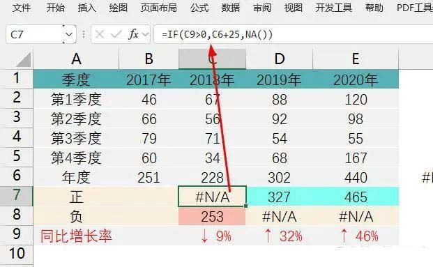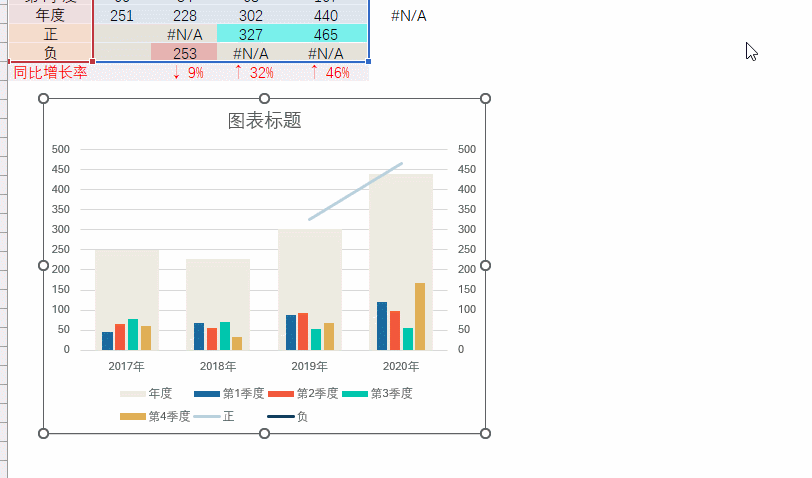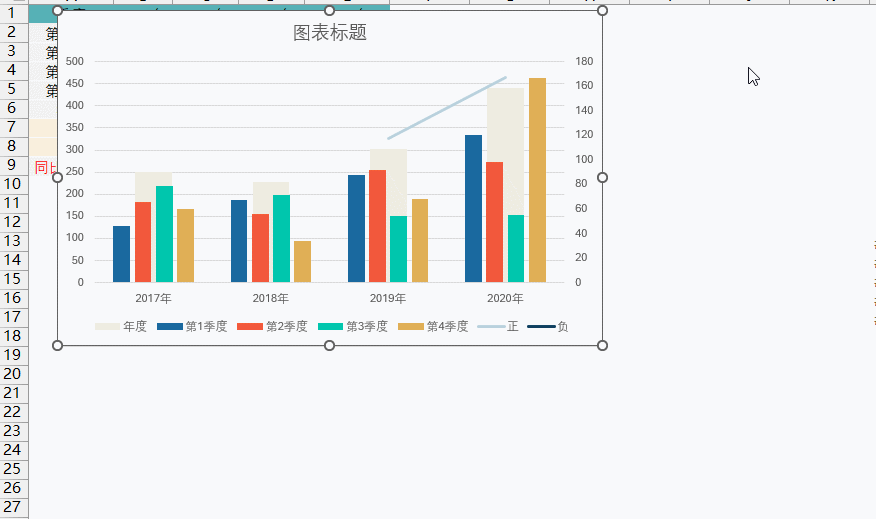 把四个季度数据设置为次坐标,然后把正和负修改为折线图