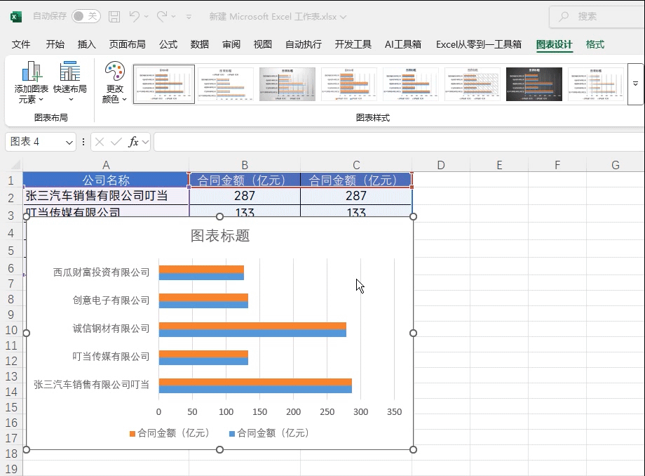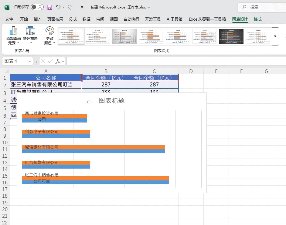 对于名字很长的,图表的选择就比较固定了,建议大家选择条形图,条形图一般都是横着显示,能显示更多的内容,这一点是其他图表无法比拟的