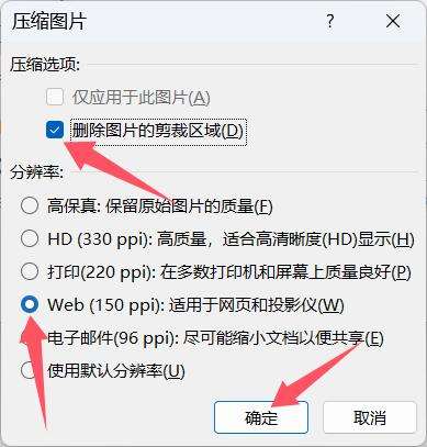 5、在打开的【压缩图片】对话框中,勾选【删除图片的剪裁区域】,选择ppi较低的分辨率选项:电子邮件(96ppi)或Web(150ppi)。这里选择Web(150ppi),最后点击【确定】。