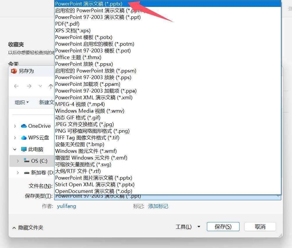 3、打开【另存为】对话框,点击【保存类型】编辑框下拉按钮,在弹出的列表中选择【PowerPoint演示文稿(*.pptx)】的格式。