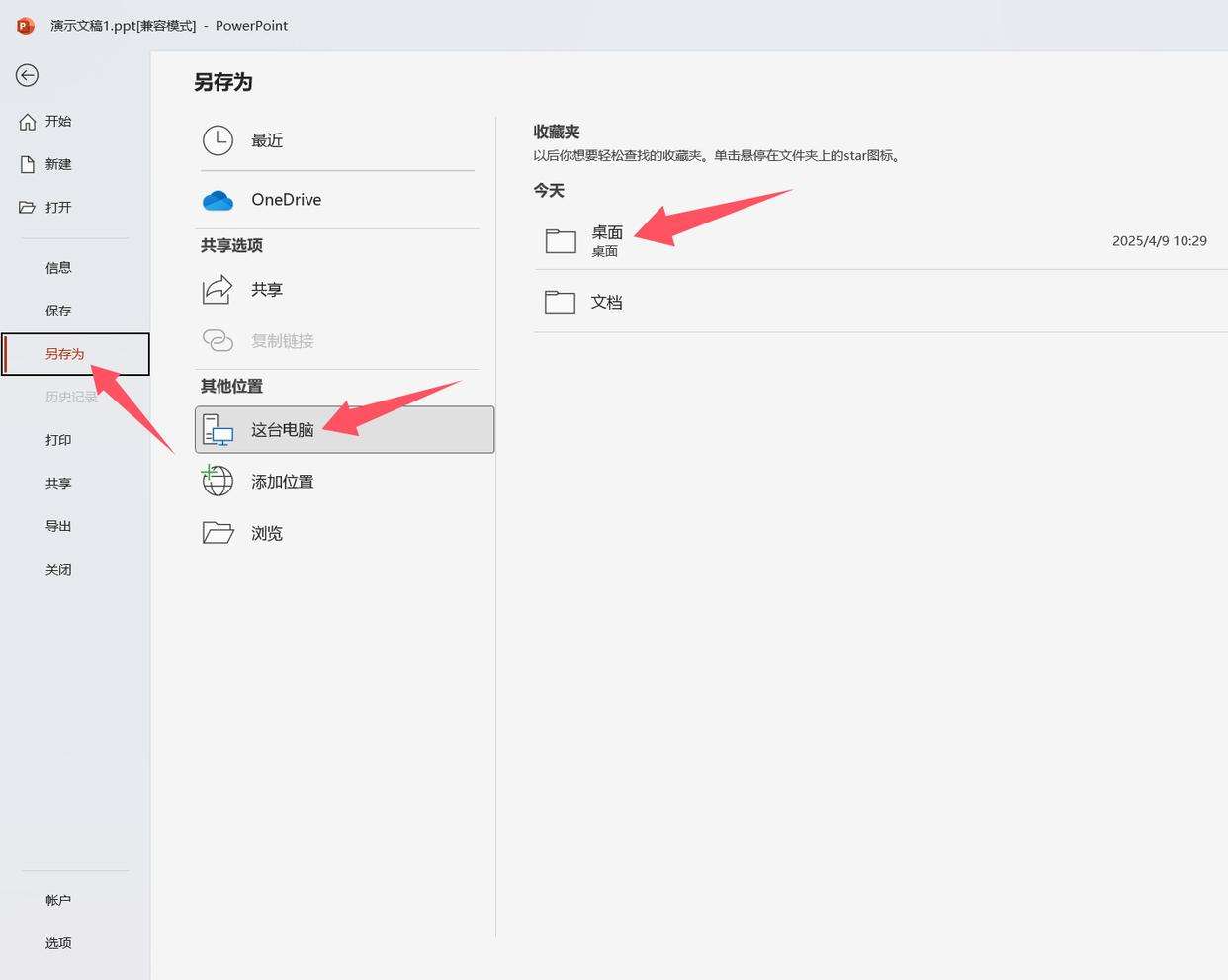 2、在打开的界面中选择【另存为】,再选择保存位置,这里设为【这台电脑】的【桌面】。