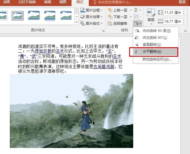 5、点击“水平翻转”选项之后,我们在幻灯片中就能看到图片画面已经完成镜像翻转了