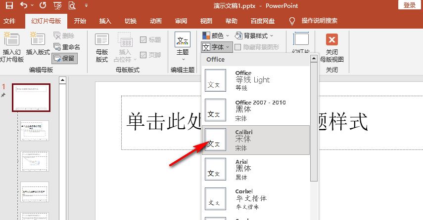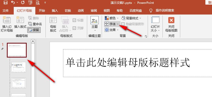 3、在幻灯片母版页面中,我们先点击第一也幻灯片,然后在工具栏中打开“字体”工具