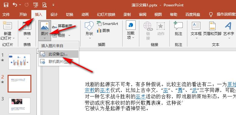 2、进入PPT页面之后,我们在插入的子工具栏中打开“图片”工具,然后在下拉列表中点击“此设备”选项