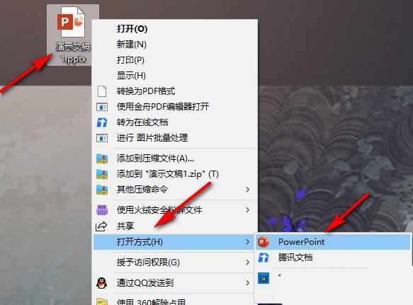 1、我们先右键单击一个演示文稿,然后在菜单列表中点击“打开方式”选项,接着在子菜单列表中选择“powerpoint”选项