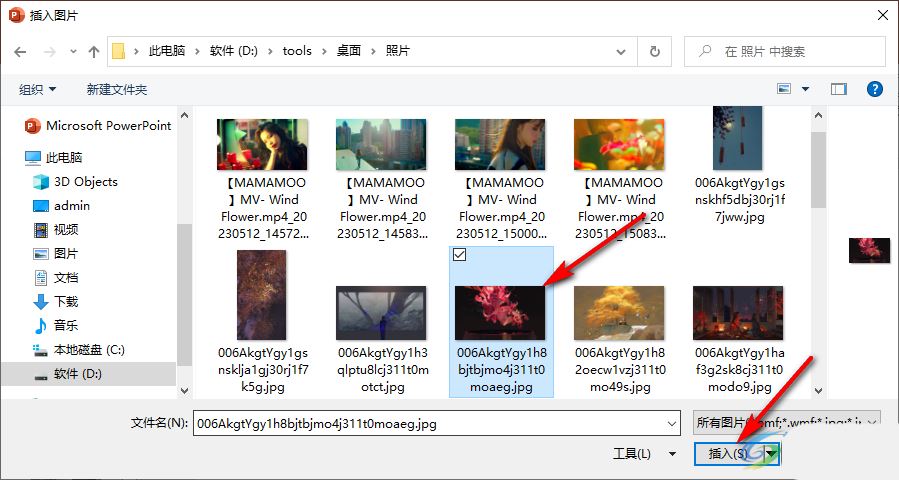 3、进入文件夹页面之后,我们找到准备好的图片,然后点击“插入”选项
