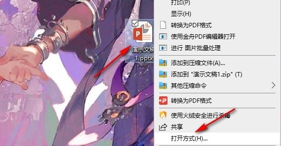 1、第一步,我们先右键单击一个演示文稿,然后在演示文稿的菜单列表中点击“打开方式”选项,再点击选择“powerpoint”选项
