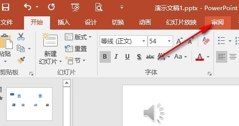 2、第二步,进入PPT的幻灯片编辑页面之后,我们再在该页面中找到“审阅”工具,点击打开该工具
