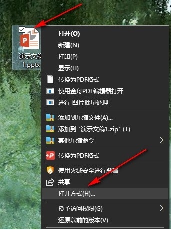 1、第一步,我们在桌面选择一个演示文稿,右键单击该演示文稿,再在菜单列表中点击“打开方式”和“powerpoint”选项