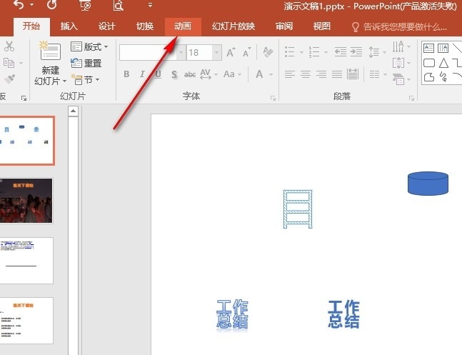 2、第二步,用PPT程序打开演示文稿之后,我们再在演示文稿页面的工具栏中点击打开“动画”工具
