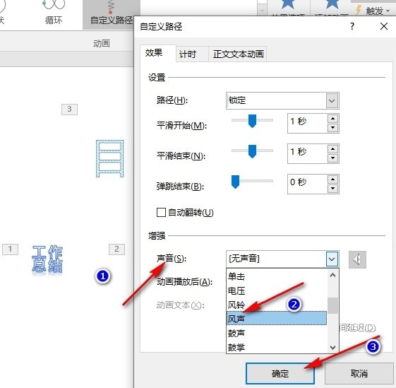 5、第五步,打开自定义路径弹框之后,我们在该页面中打开声音选项,然后在下拉列表中选择一个自己需要的声音,最后点击“确定”选项即可