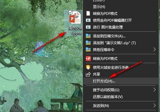1、第一步,我们在桌面右键单击一个演示文稿,然后在菜单列表中找到“打开方式”选项,点击该选项,再点击选择“PowerPoint”选项