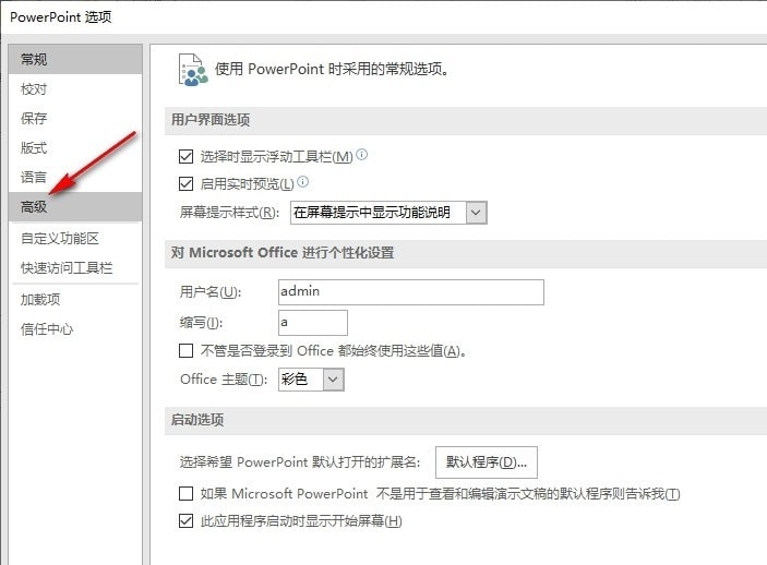 4、第四步,进入PowerPoint选项页面之后,我们在左侧列表中找到“高级”选项,点击打开该选项