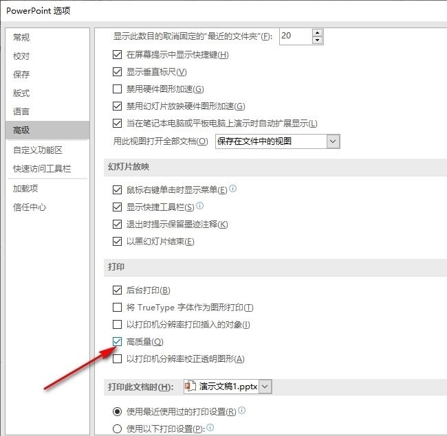 PPT如何设置默认高质量打印?其实我们只需要进入powerpoint选项页面,然后在该页面中先打开“高级”选项,再点击勾选“高质量”选项,最后点击确定选项即可