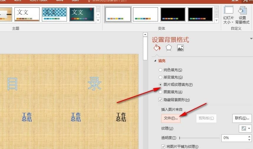 3、第三步,在设置背景格式窗格中,我们先将填充方式改为“图片或纹理填充”,然后点击打开“文件”选项
