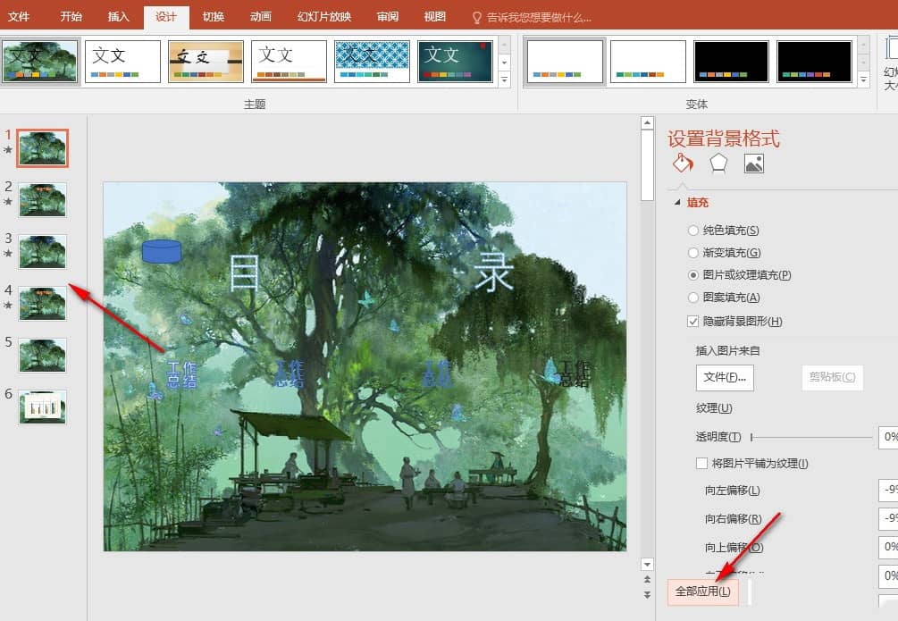 5、第五步,设置好一页幻灯片的背景之后,我们在设置背景格式的窗格中点击“全部应用”选项,就能将该背景添加到所有幻灯片中了