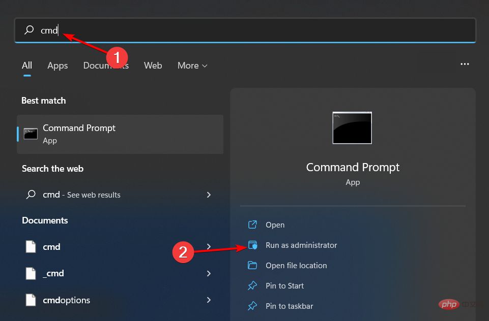 按键,在搜索栏中键入cmd,然后单击以管理员身份运行。