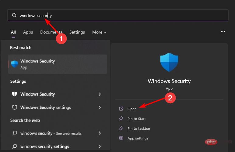 按“开始”菜单图标,搜索“Windows 安全中心”,然后单击“打开”。