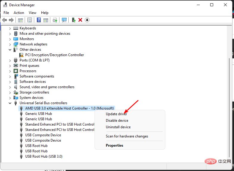 导航到硬件设备部分(在本例中为通用串行总线),右键单击您的设备,然后选择更新驱动程序。