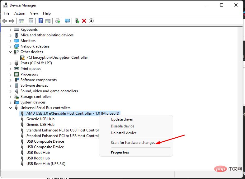 导航到硬件设备部分(在本例中为通用串行总线),右键单击您的设备,然后选择扫描硬件更改。
