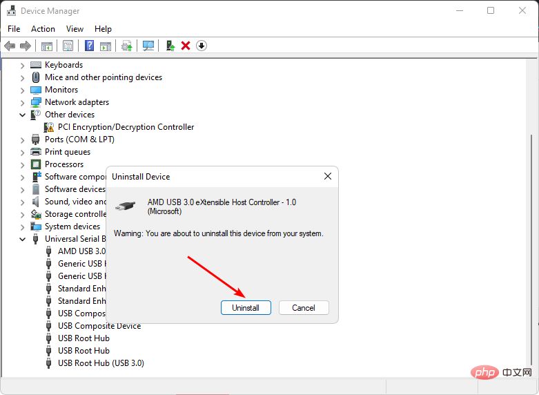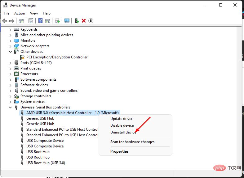 导航到硬件设备部分(在本例中为通用串行总线),右键单击您的设备,然后选择卸载设备。
