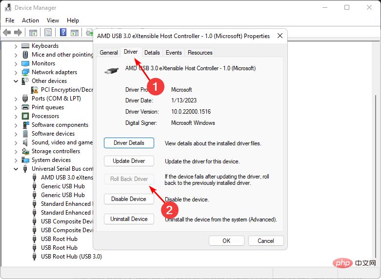 单击“驱动程序”选项卡,然后选择“回滚驱动程序”。