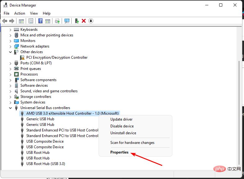 导航到硬件设备部分(在本例中为通用串行总线),右键单击您的设备,然后选择属性。