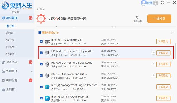 2、如果提示声卡驱动异常或可更新,点击“升级驱动”按钮,下载并安装最新版的声卡驱动。