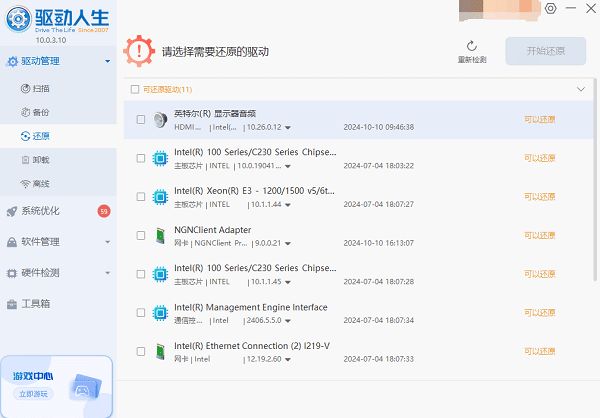 1、打开驱动人生的“驱动管理”-“还原”界面,将声卡驱动回滚到旧版驱动。