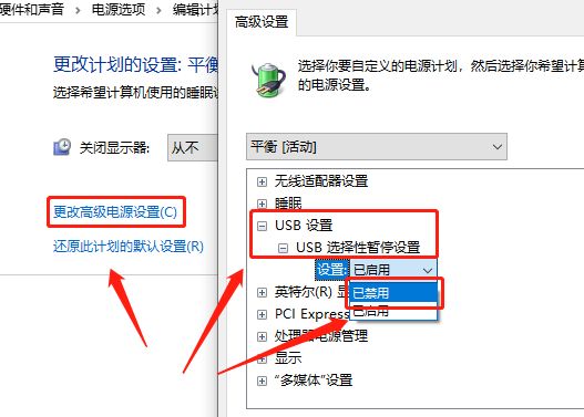 进入电源计划设置,找到USB设置-USB选择性暂停设置,将其设置为已禁用。