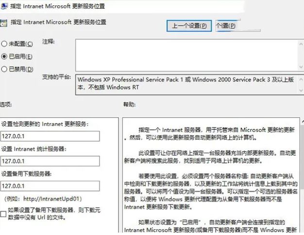 备注:系统默认是“未配置”状态,即windows可自动更新。若不想要系统自动更新,可以点击“已启用”,然后在“设置检测更新的Intranet更新服务”填写127.0.0.1 (注:127.0.0.1为本机IP),这样一来,系统就不会自动更新,于是就会出现文章开头的“无法连接到更新服务”的提示信息了。
