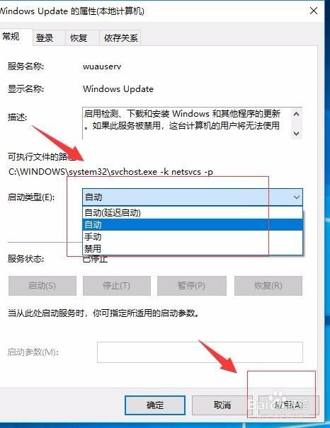 接着,在Windows Update服务窗口中,点击“启动类型”下拉菜单,在弹出的菜单中选择“自动”,然后点击“应用”按钮 。如图: