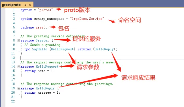 在 Protos 文件夹中,默认会生成一个 greet.proto 文件。我们可以修改或创建新的 .proto 文件来定义自己的服务。