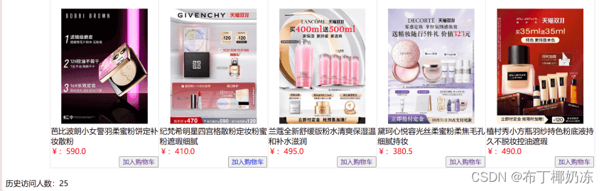 1. 编写一个页面,展现商品列表(静态页面),页面右上方有登陆、结账和查看购物车三个按钮,下方展示网站历史访问的人数