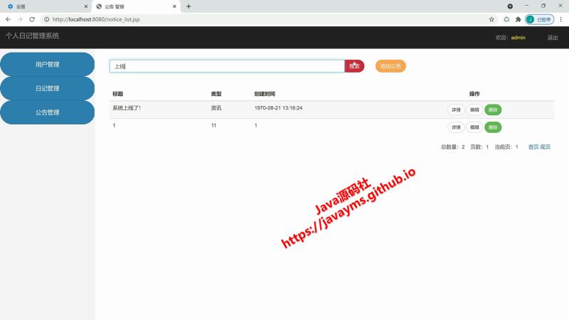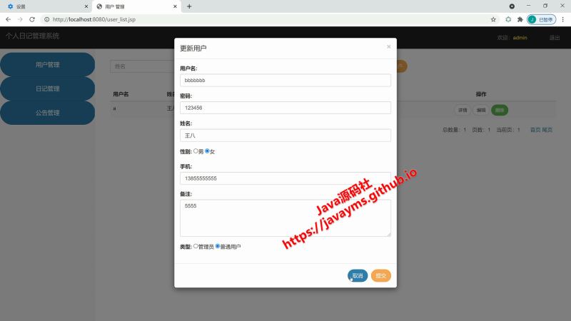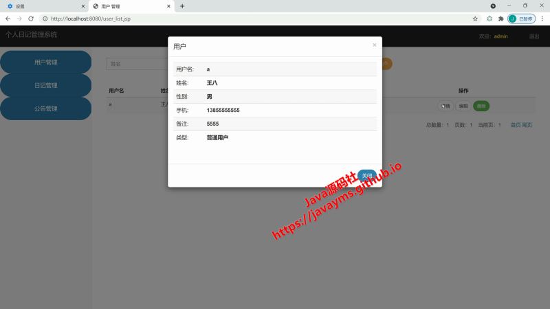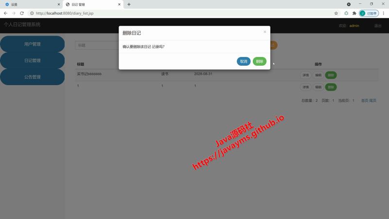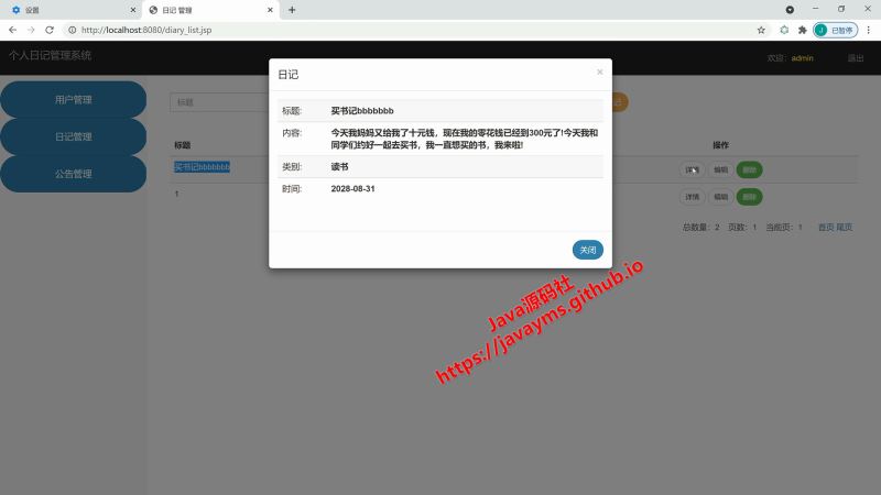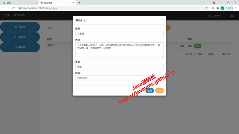 以上就是基于javaweb+jsp实现个人日记管理系统的详细内容,更多关于javaweb jsp个人日记管理系统的资料请关注其它相关文章!