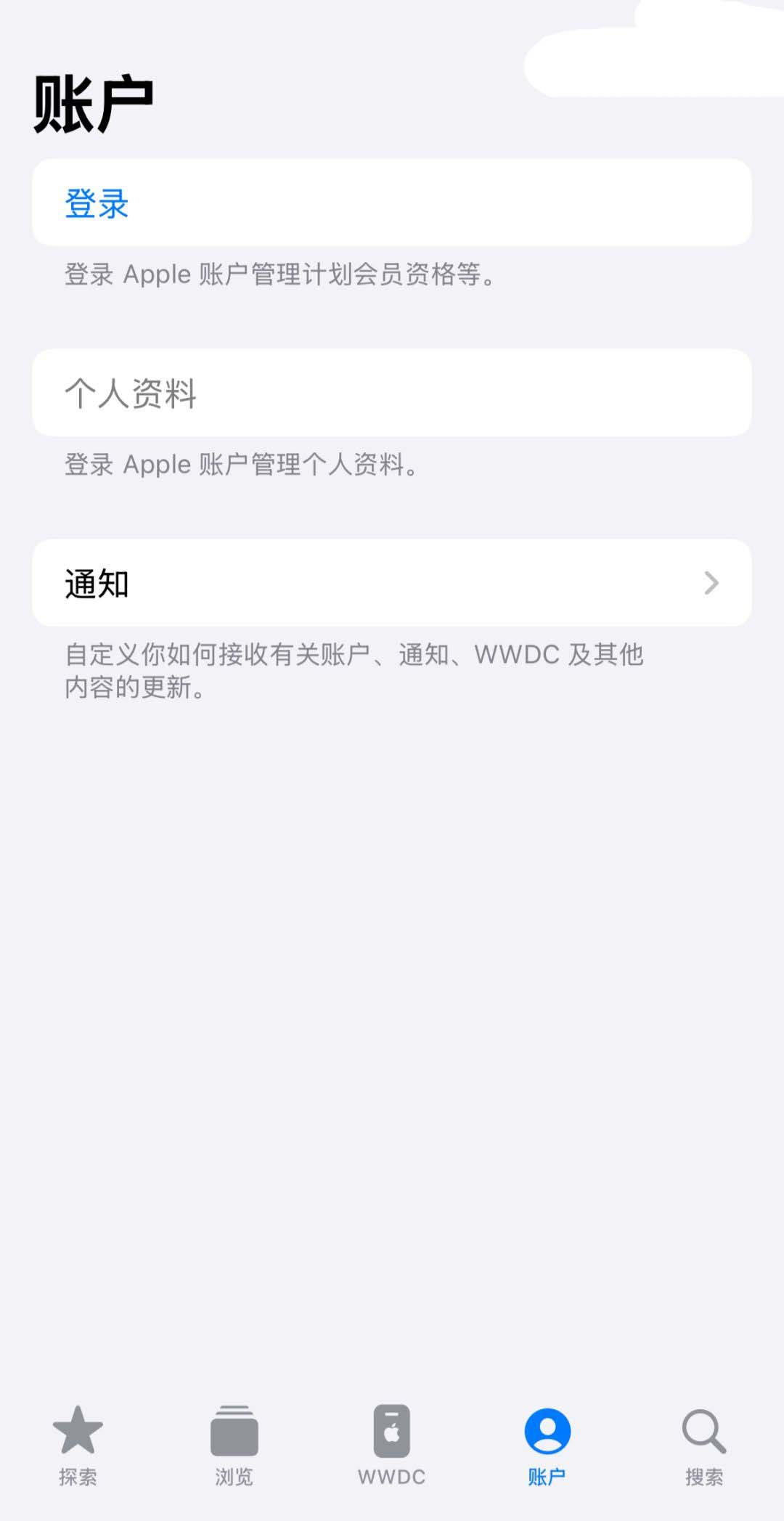下载完成后,在 Apple Developer 应用中点击底部“账户”,然后登录 Apple ID。注意,这里一定要使用邮箱 ID,不要用手机号。如果没有邮箱 ID,需要新注册一个。