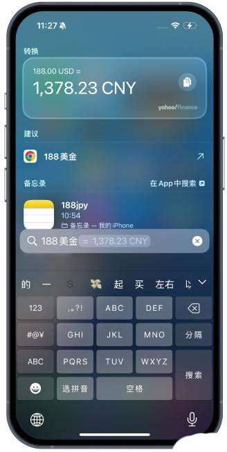 换算步骤:在iPhone主界面下滑进入搜索框,输入金额和货币,就会自动换算成人民币。